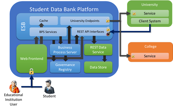 StudentDataBank.org (SDB – an imaginary org) is an organization that offers secure online storage and controlled exchange of student records between universities, colleges, schools and other types of Educational Institutes (EI). An EI can establish a secure interface with Student Data Bank and upload its Courses, Programs, Students and Student’s Course Results. Then another EI can request a Student’s Record to be fetched from the offering EI. Student Data Bank (SDB) takes care of securely validating the request and fetching Student Records from an EI’s systems via the secure interface that EI has already established with the SDB. Thus SDB works as a broker between multiple EIs, empowering each to share student records with each other in a secure and auditable manner.