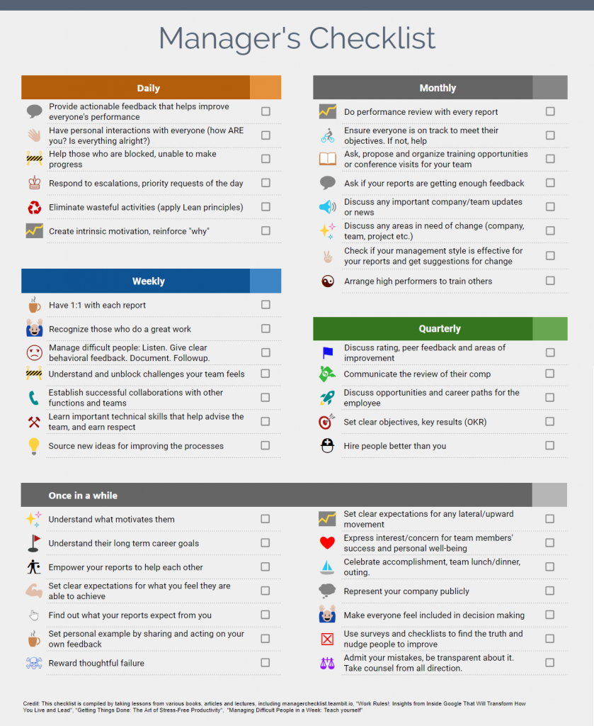I have compiled this list from various resources that I have come across over the years. Hope it helps other managers out there. Credit goes to those amazing authors and speakers whose ideas have changed my life, and gave birth to this checklist. I am just a compiler.